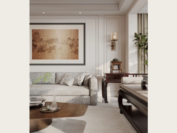 画里的亭台烟柳,刚好和墙面的石膏线条形成 “虚实呼应”。线条是现代空间的利落,画里是传统意境的朦胧,早上拉开窗帘,阳光斜斜扫过画框,连沙发靠垫上的暗纹,都跟着沾了点 “烟柳画桥” 的诗意。