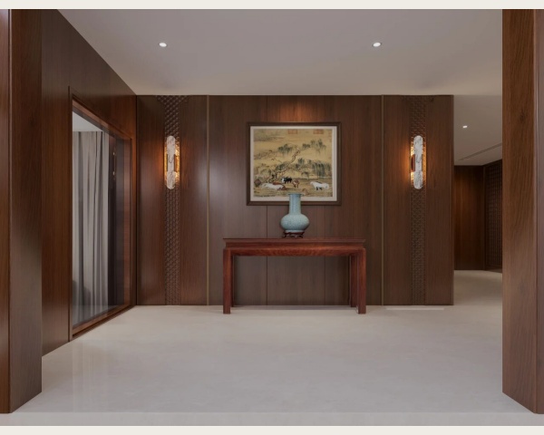 在过道尽头放置条案,搭配挂画与绿植,形成 “一步一景” 的视觉节奏,狭长的过道易显单调,条案成为 “空间缓和剂”。