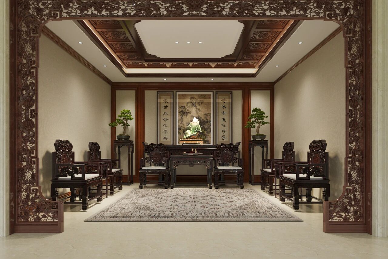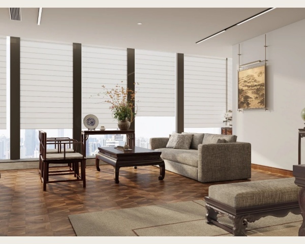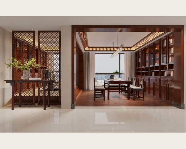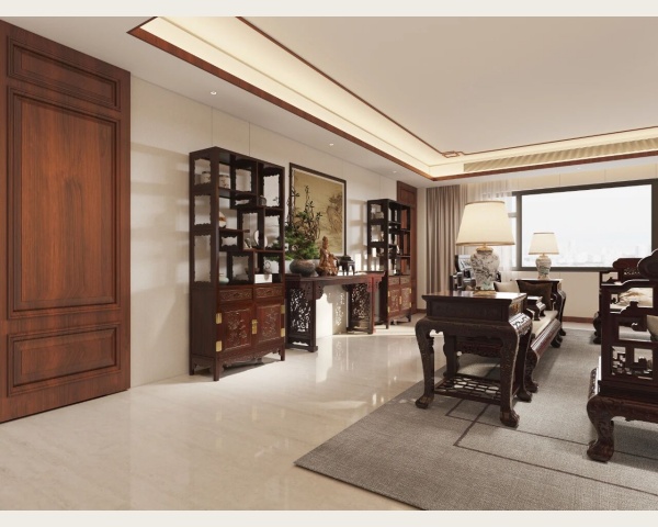 置于沙发背后,两侧搭配柜架,或独立成景,陈列古籍、艺术品或灯具,与中式家具碰撞呼应,既保留中堂文化底蕴,又赋予空间淡淡雅韵。