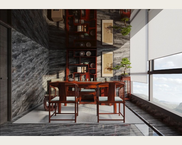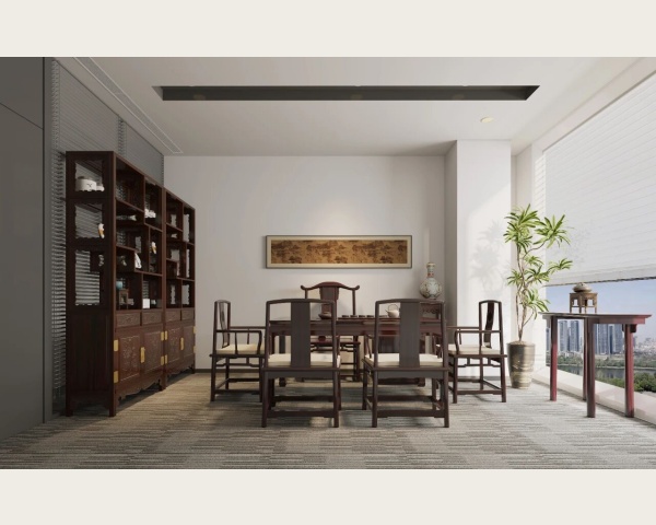 搭配山水景观或瓶花,在茶香氤氲中,条案为茶室勾勒出 “虚实相生” 的雅致留白,让品茗从日常烟火升华为文化体验。