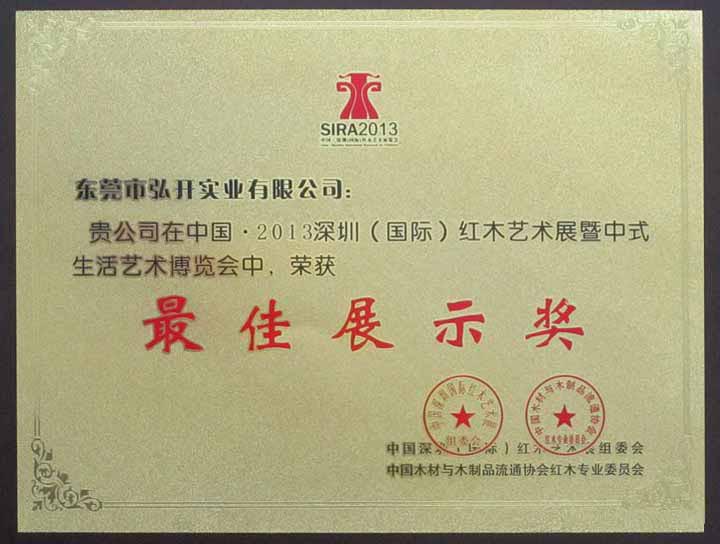 本公司在中国·2013深圳(国际)红木艺术展暨中式生活艺术博览会中荣获最佳展示奖
