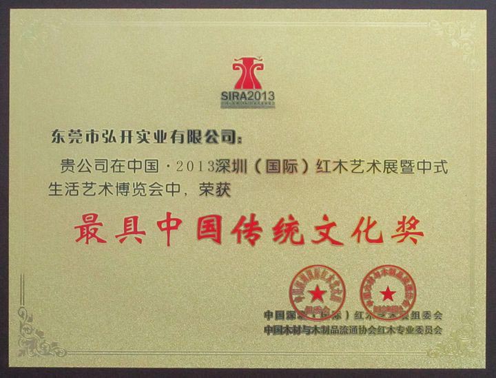 本公司在中国·2013深圳(国际)红木艺术展暨中式生活艺术博览会中荣获最具中国传统文化奖