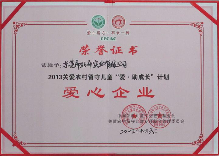 本公司被授予2013关爱农村留守儿童“爱·助成长”计划爱心企业