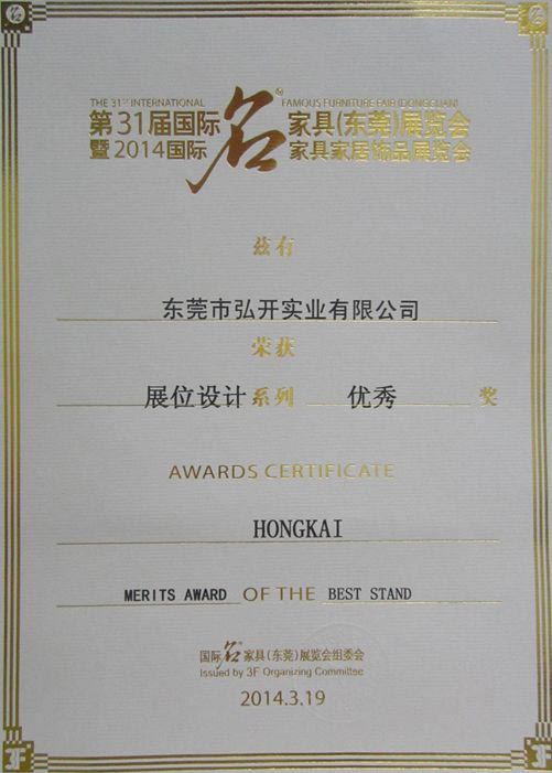本公司荣获第31届国际名家具(东莞)展览会暨2014国际名家具家居饰品展览会展位设计系列优秀奖