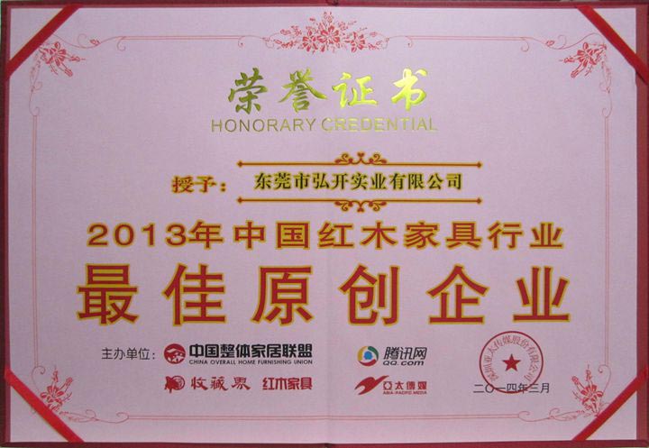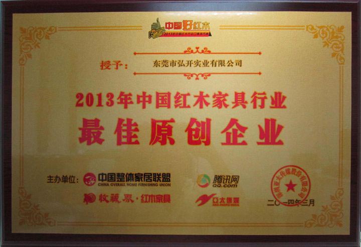 本公司被授予2013年中国红木家具行业最佳原创企业称号