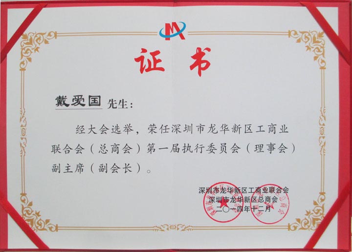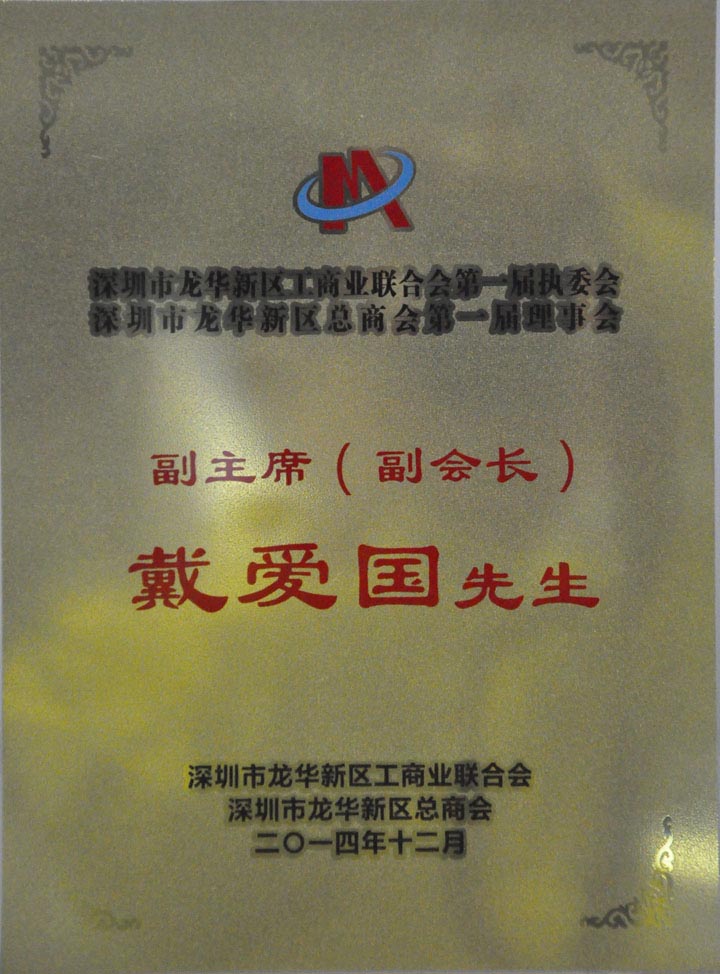 总裁戴爱国先生被选任为深圳市龙华新区工商业联合会第一届执委会、深圳市龙华新区总商会第一届理事会副主席(副会长)