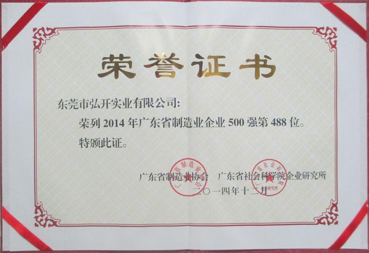 本公司荣获广东省制造业企业500强(2014年度)