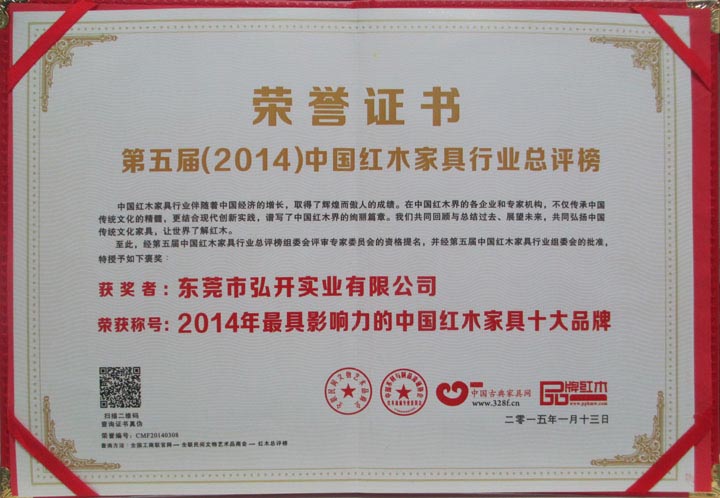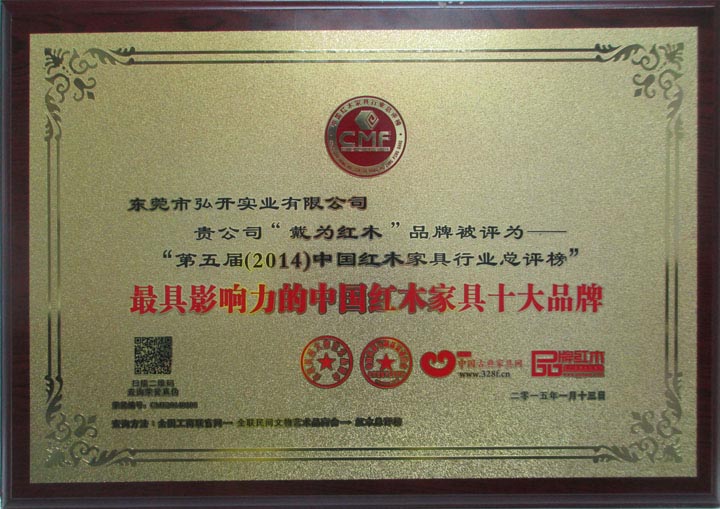 戴为红木被评为“第五届(2014)中国红木家具行业总评榜”最具影响力的中国红木家具十大品牌