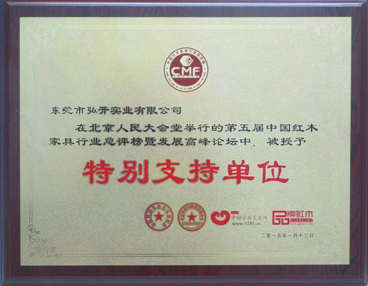 本公司被在北京人民大会堂举行的第五届中国红木家具行业总评榜暨发展高峰论坛授予特别支持单位