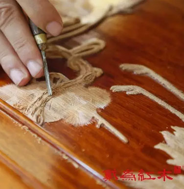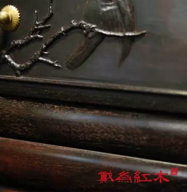 创意之+ ORIGINALITY 新工艺——紫檀髹色 一种基于传统手法的髹漆新工艺, 让大果紫檀焕发更加迷人的“小叶紫檀”魅力。 戴为红木使用环保生漆,把大果紫檀的橙黄橘黄木色做成小叶紫檀的暗红紫红木色,这里使用很传统的手工工艺——木融水色处理。这种工艺,要把水色充分融入木头里面,前后打磨不下十次,直道光滑无任何毛刺,在木头毛孔充分张开的情况下,再上水色,保证它融合到木头毛孔里面,使得整体自然而有生命力。 木面上的大果紫檀毛孔泛出一层波光粼粼的效果,源于髹漆做的是开放式,当用手触摸,可以感受每一个正在呼吸的毛孔,和它所迸发的张力。 新工艺——丝翎檀雕与花梨木 一种基于丝翎檀雕技艺在花梨木上生花的新工艺,让大果紫檀焕发出更加迷人的“生命灵气”。 戴为红木工匠们结合传统木雕的工艺,将工笔国画经过再创造并以浅浮雕的形式立体呈现在大果紫檀家具上,从临摹到亲自雕刻,不断地练习和研究,通过"取神得形,以线立形,以形达意"获取神态与形体的完美统一,通过花梨木载体立体地呈现,绽放出生命花,独具东方神韵,散发出高贵的气息,是一大创新。